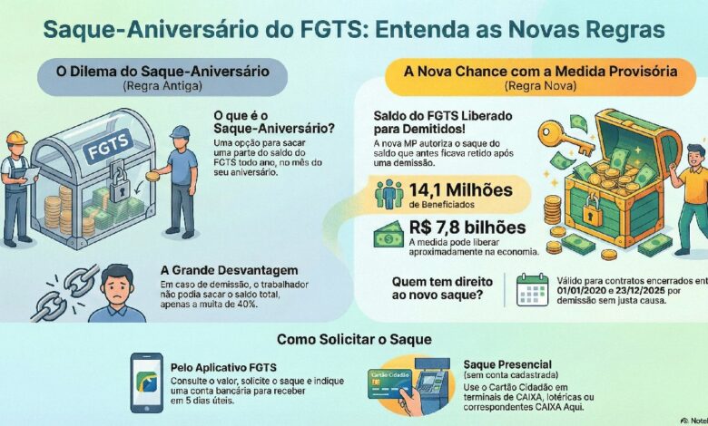 Uma Medida Provisória (MP 1.331/2025) autorizou a liberação de saldos que estavam retidos para trabalhadores que optaram pelo saque-aniversário e foram demitidos sem justa causa entre janeiro de 2020 e dezembro de 2025. Esses trabalhadores agora podem sacar integralmente seus saldos do FGTS, somados à multa rescisória.